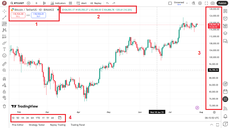 اولین قدم برای یاد گرفتن معامله توی تریدینگویو و آتو تی کریپتو اینه که اول با قسمتهای مختلف داشبوردش آشنا بشی. توی تصویر پایین چهار تا بخش مهم رو میبینی که هرکدوم یه سری اطلاعات کاربردی درباره قیمت دارایی بهت میدن: